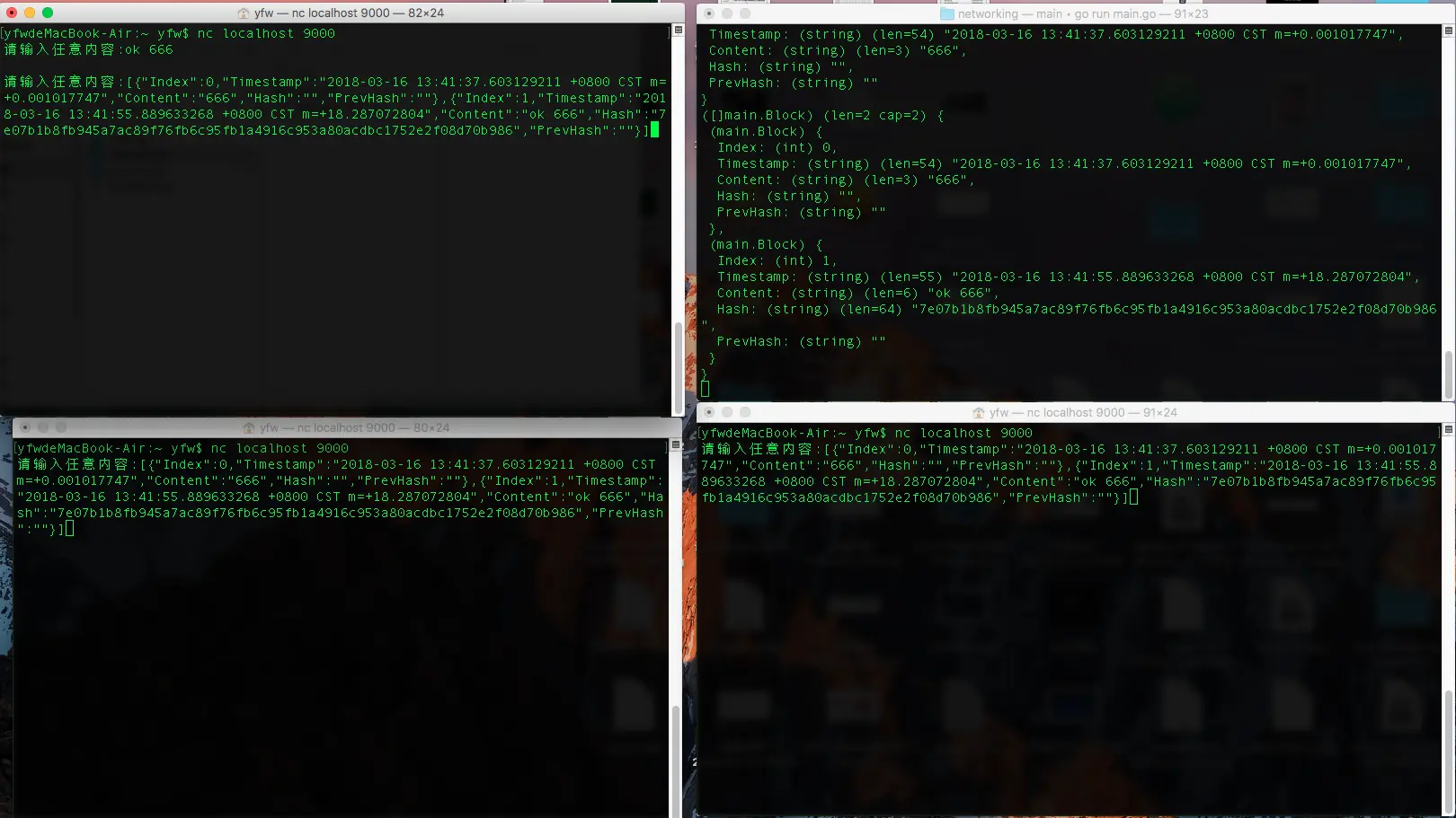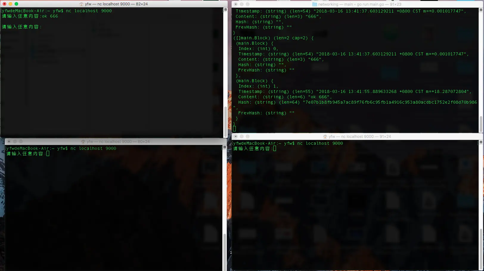 好的,完成代码在:https://github.com/sunqichao/blockchainNetwork ,我们现在运行一下 go run main.go 然后再开启一个终端用 nc localhost 9000 这个命令来连接,如图: