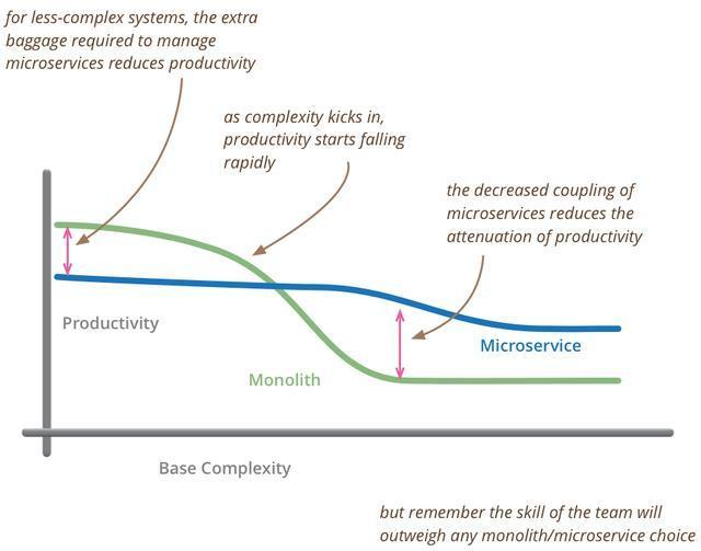 马丁指出,当业务不复杂,团队规模不大的时候,单块架构比微服务架构具有更高的生产率(productivity),原因在于建立微服务架构需要额外的开销来支持和管理微服务,从而降低生产率;但是随着业务复杂性的增加和团队规模的扩大,单块架构比微服务架构的生产率下降更趋明显,当复杂性达到一个点,微服务架构的生产率会优于单块架构,原因在于微服务的松散耦合自治特性减缓了生产率的下降趋势。