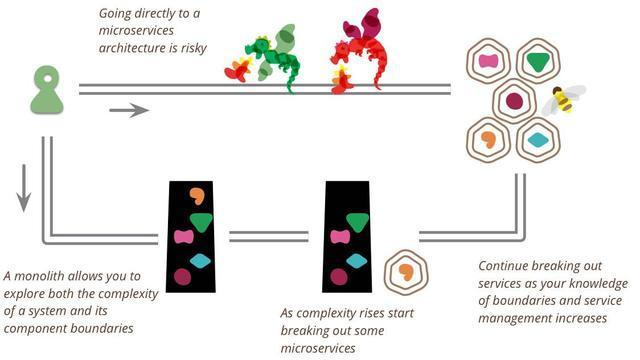 马丁建议企业应用走单块优先的架构思路,先轻装上阵,赢得时间探索系统的复杂性和领域边界,当复杂性增加时,拆出部分微服务,随着团队对服务边界更加清晰和服务管理能力的提升,持续拆分出更多微服务,最终演化出微服务架构。