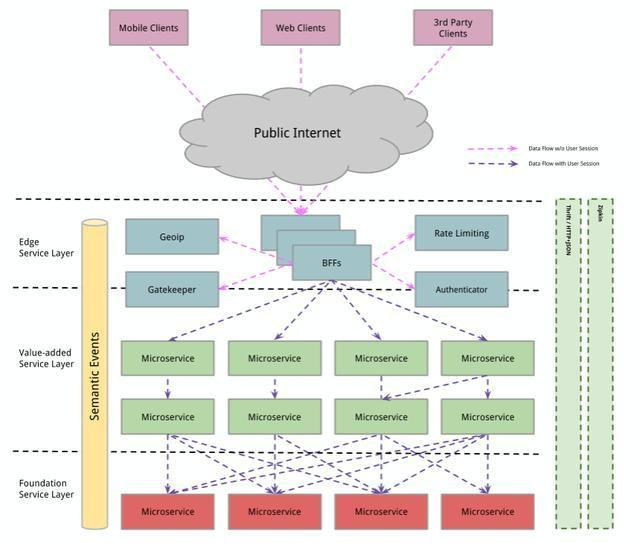 SoundCloud将Geoip、限流、安全认证等跨横切面功能和BFF做在同一层,没有像Netflix/携程一样做在独立的网关层,SoundCloud的这一做法有性能优势,但同时也增加了BFF层的复杂性;