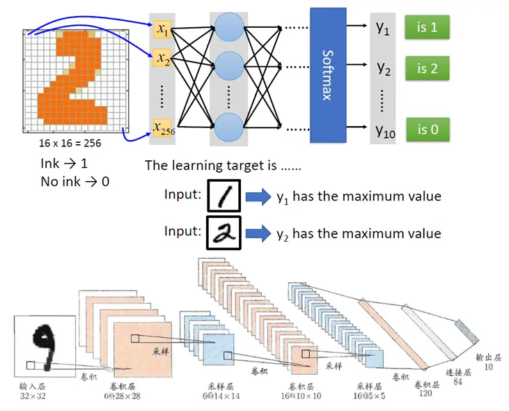 对于任何一张神经网络,谁也不敢保证输入是2,输出一定是第二个数字最大,要保证这个结果,需要训练和学习。毕竟看到美女而瞳孔放大也是人类很多年进化的结果。学习的过程就是,输入大量的图片,如果结果不是想要的结果,则进行调整。如何调整呢,就是每个神经元的每个权重都向目标进行微调,由于神经元和权重实在是太多了,所以整张网络产生的结果很难表现出非此即彼的结果,而是向着结果微微的进步,最终能够达到目标结果。当然这些调整的策略还是非常有技巧的,需要算法的高手来仔细的调整。正如人类见到美女,瞳孔一开始没有放大到能看清楚,于是美女跟别人跑了,下次学习的结果是瞳孔放大一点点,而不是放大鼻孔。