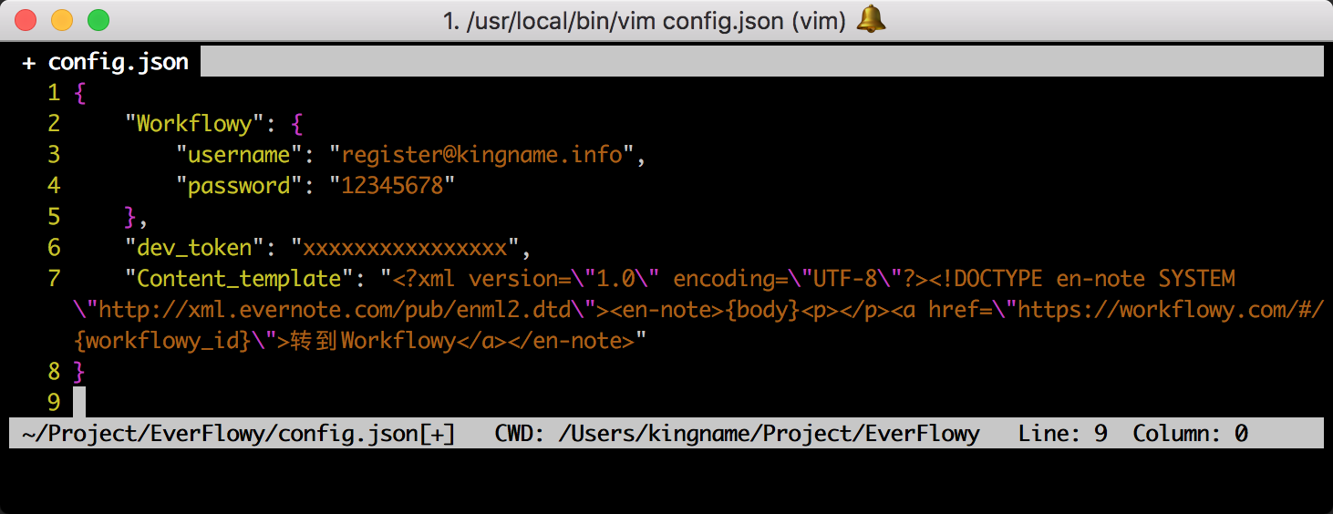 你需要修改三个地方,分别是username,password和dev_token。其中username和password分别对应了Workflowy的用户名和密码,而dev_token是印象笔记的开发者Token。