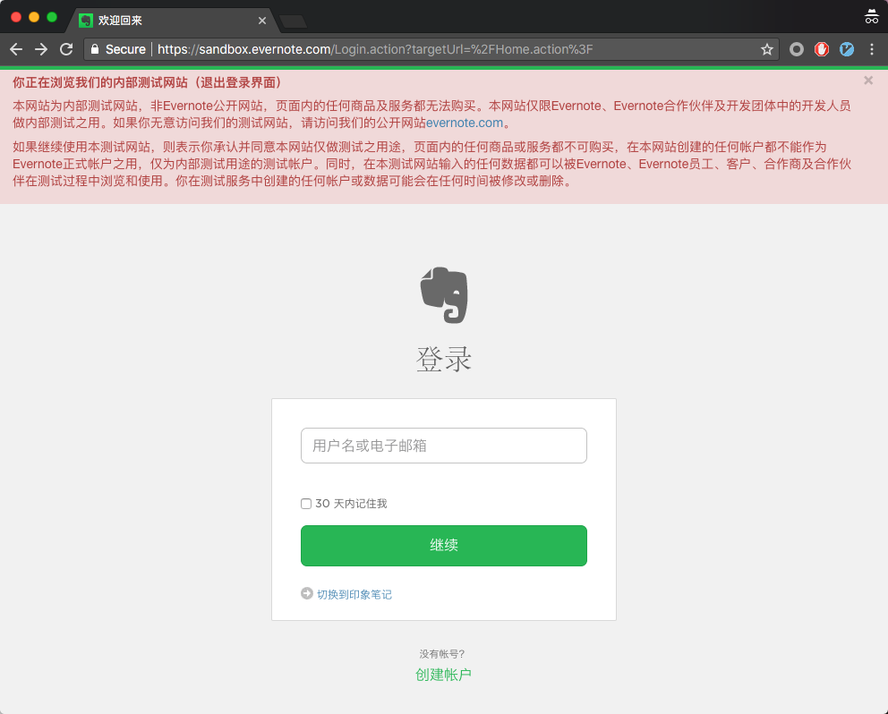 这里需要说明一下印象笔记的开发者Token。印象笔记的开发者Token有两套,分别是沙盒环境的开发者Token和生产环境的开发者Token。所谓沙盒环境,就是一个测试开发环境,这个环境是专门为了快速开发印象笔记App而设计的,它的地址为:sandbox.evernote.com。打开这个网址,可以看到页面上弹出了警告,如下图所示。