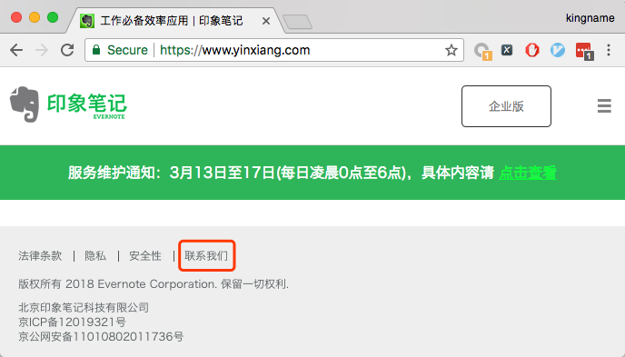 登录自己的印象笔记正式账号,打开印象笔记首页,把页面拉到最下面,可以看到有一个“联系我们”,如下图所示。
