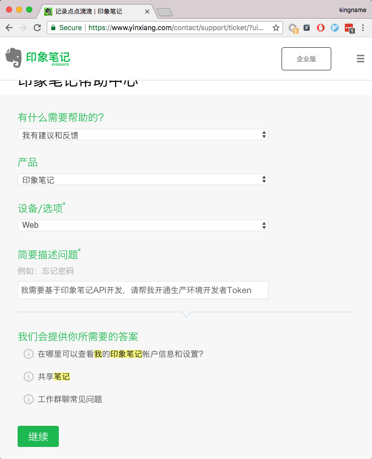 在联系客服的页面填写如下信息,最后一项“简要描述问题”填写“我需要基于印象笔记API开发,请帮我开通生产环境开发者Token”并提交。