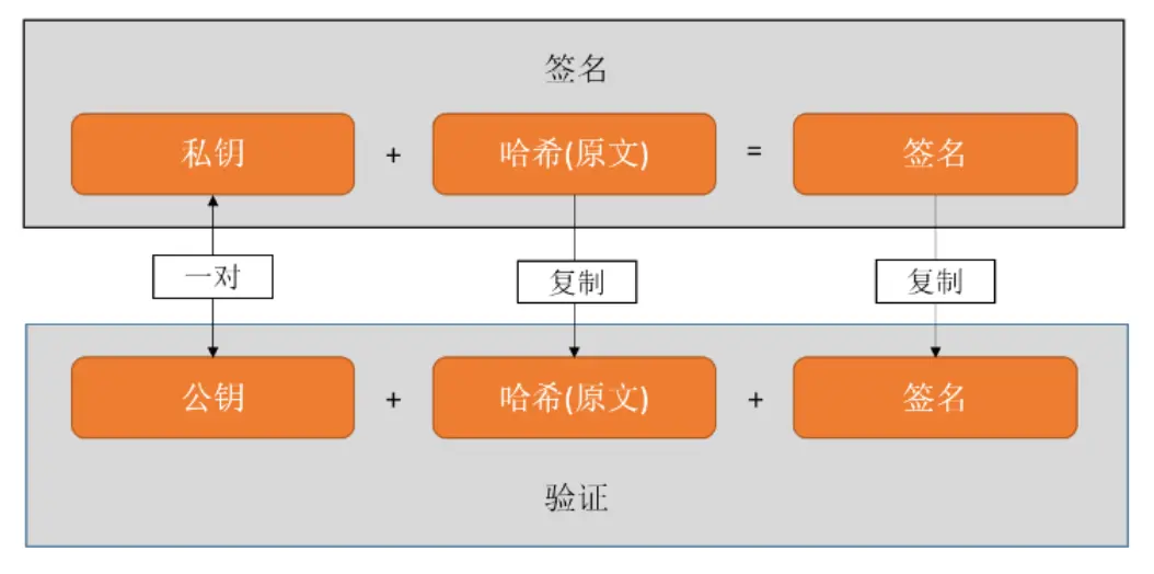 原理:数字签名是基于非对称加密技术和数字摘要技术的应用。我们知道非对称加密技术会产生一对密钥:公钥和私钥,私钥加密的数据,要公钥才能解密,反之亦然。数字签名技术基于该特性实现,分为两个过程:一个用于签名(加密过程),另一个用于验证(解密过程),如下图所示。