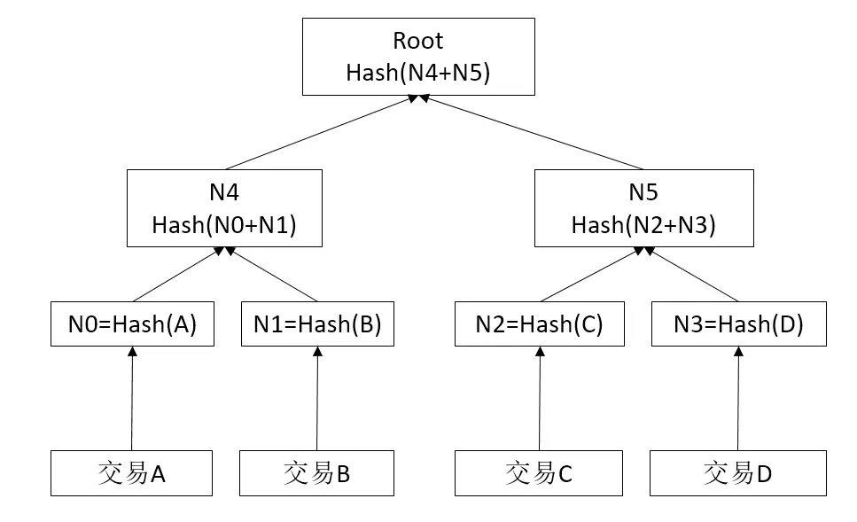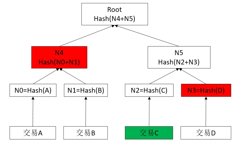 Step1:获取交易C的哈希值,N2=Hash(交易C) Step2:通过N2和N3的哈希值,得到父节点的哈希值:N5=Hash(N2+N3) Step3:同上,通过N4和N5的哈希值,得到根节点的哈希值:Root=Hash(N4+N5) Step4:然后将上一步得到的根哈希值对比区块头中MerkleTree的根哈希值,如果相同,则证明该区块中存在交易C,否则说明不存在 |