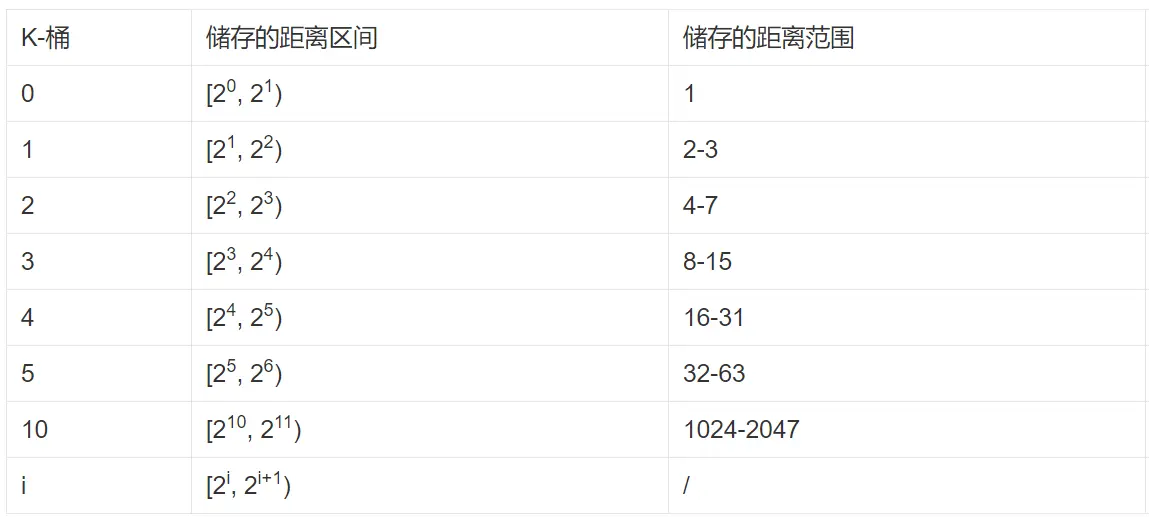 备注:确定对应的K-桶是通过上表中每个节点存储的距离范围确定。