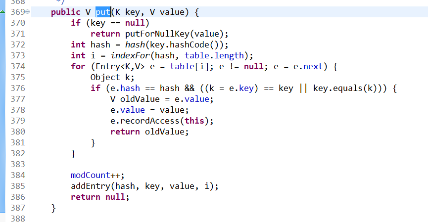 综上所述HashMap实例化和存值过程就是生成一个Entry的数组,每个数组元素是一个单链表,在put时发现要put的元素的key在单链表中已经有了则将原有数据覆盖,并返回原来的value376到380行,如下图