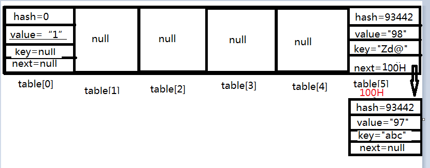 过程一样,你会发现他的hash也为93422,i也是5,看374行此时的table[5]已经不是null了,进入for循环,if(1&&0),故退出循环,执行了 addEntry()方法形成下图