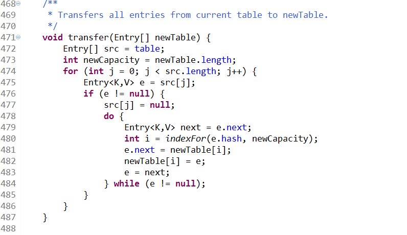 标注一个点我们知道HashMap是线程不安全的,简单来说就是因为扩容是设计到了引用的赋值(指针的移动),在两个线程同时对HashMap扩容是会造成Entry中的next保存的是自己本身的引用,这样造成do while 的死循环,也就是e=next ;永远是自己赋值自己
