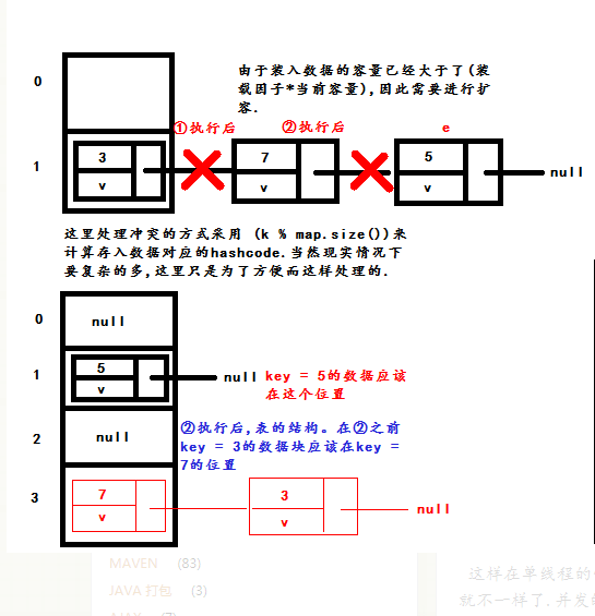 } 在旧的HashMap中是在同一链表中的,但在扩容后key="abc"和key="Zd@"还会在同一链表里,单顺序变了,置于newtable[93442&31]=newtable[2],至于key="2" 则会放在 newtable[50&31]=newtable[18]的位置(图中key=3,key=7,key=5依次对应key="abc",key="Zd@",key="2")图片来自网路