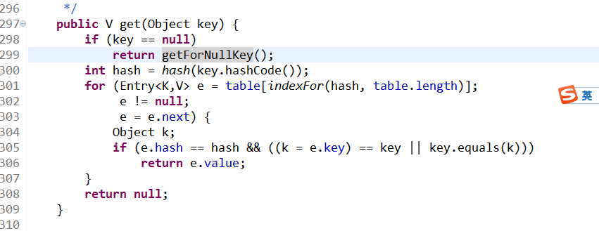 有了上面的添加的过程,在看获取的过程就简单多了,299行获取key=null就别说了,直接将table[0]中的value返回就是了,对于其他key的情况同样是先比较hash值在比较单链表中key的equals()发现条件(1&&1)时返回对应value。