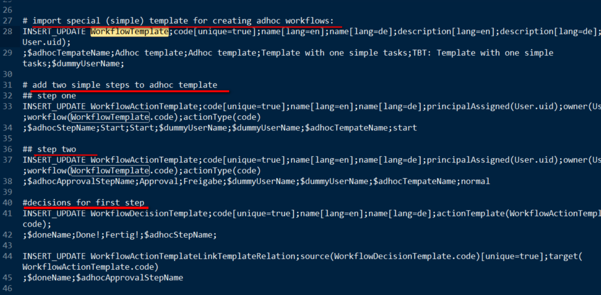 impex 中包括 WorkflowTemplate, WorkflowActionTemplate, WorkflowDecisionTemplate, WorkflowActionTemplateLinkTemplateRelation 这四种类型的model