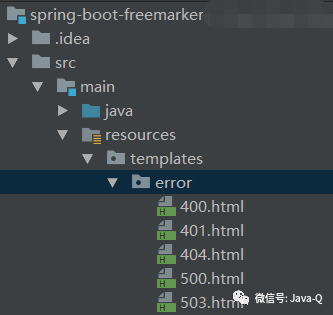 如果想为指定的状态码显示一个自定义的错误页面,可以将这个自定义的错误页面添加到/error目录下。错误页面可以是静态HTML,也可以是使用模板构建的文件,例如freemarker,文件的名称必须是确切的状态码。例如使用freemarker模板引擎,并且模板后缀名为.html,可以有如下自定义错误页面。