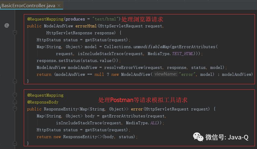 通过断点调试可以发现,当请求一个不存在的url或服务端处理发生异常时,Spring Boot捕获到这个异常后会请求/error,这个/error请求会在BasicErrorController中处理,这个类里面有两个重要处理方法errorHtml和error。默认情况下浏览器发送的请求头中Accept为text/html,所以此时请求进入errorHtml方法处理,Spring Boot会响应一个“Whitelabel Error Page”页面;当使用Postman等调试工具发送请求时,默认情况下请求头中没有Accept信息,所以请求进入error方法处理,Spring Boot会返回一个Json格式的错误信息字符串,具体代码如下图所示。