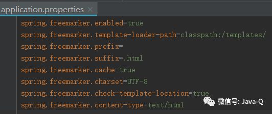 当基于Spring Boot使用FreeMarker时,上面的示例代码只在application.properties中配置了spring.freemarker.suffix=.html,显然Spring Boot做了一些默认配置,通过在application.properties中重新配置覆盖了默认配置属性值。查看源码可以看到Spring Boot做的一些默认配置:
