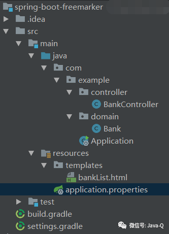 上图中Spring Boot默认配置模板文件的后缀是.ftl,而在application.properties中重新配置为.html。示例代码将bankList.html存放在了templates目录下,这是因为Spring Boot配置的默认模板文件路径是templates。Spring Boot默认配置的FreeMarker属性值都可以在spring-configuration-metadata.json中查找到,这些默认值都可以在application.properties或application.yml中选择性重新配置。
