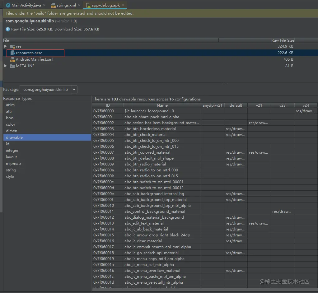 Android资源是通过AssetManager 查找资源名称加载,大部分会用getResources().getXX(int resId)方法得到一个资源,实际上Resources通过ID查找到资源名称,再交给AssetManager加载,以下resources.arsc是资源映射表,Id name都有对应关系。