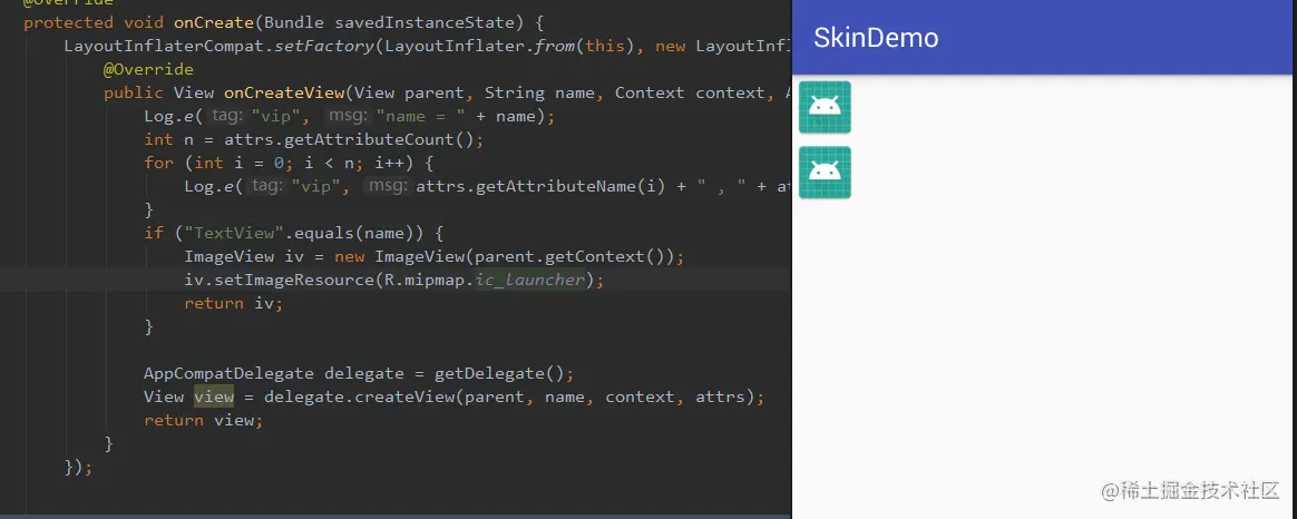 | 说明 | 白色框框部分,就是那两个Textview信息,这个例子说明每创建一个View都会走onCreateView方法。Hook的意思是说不用修改XML文件,就可以将Textview改为ImageView等其它控件。 | |
