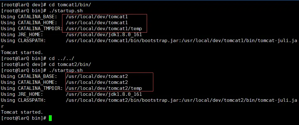 1,在 随便一个目录下 解压两个tomcat,比如我的目录为 /usr/local/dev/,如图: