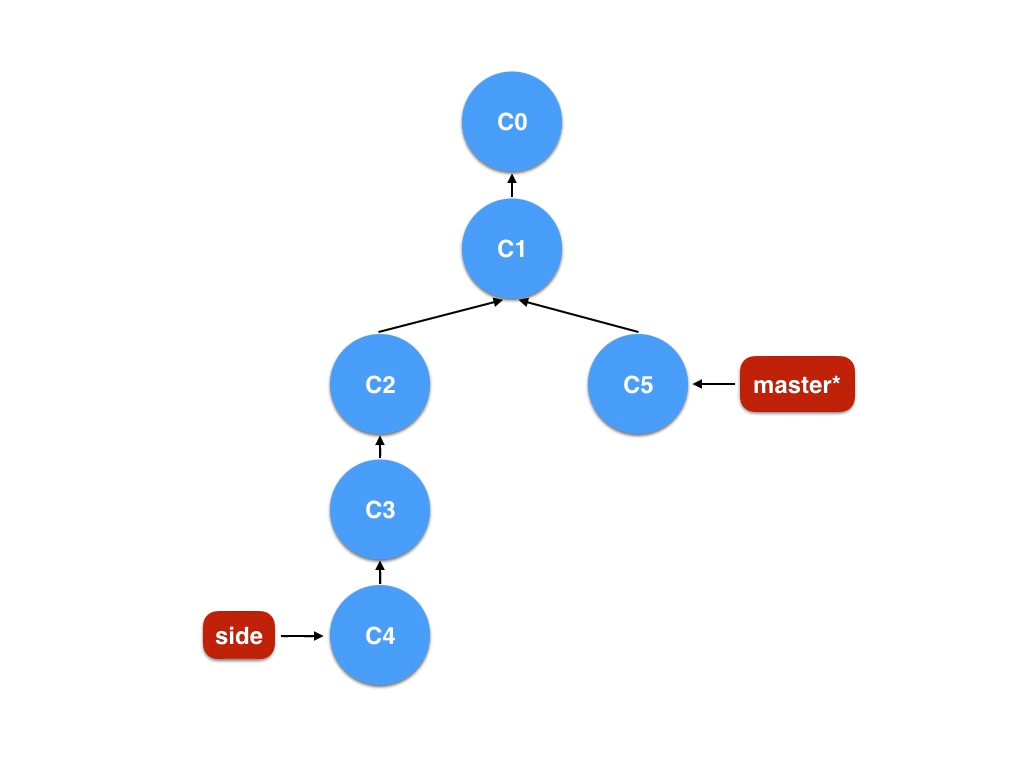这里有一个仓库, 我们想将 side 分支上的工作复制到 master 分支,你立刻想到了之前学过的rebase了吧?但是咱们还是看看 cherry-pick有什么本领吧。