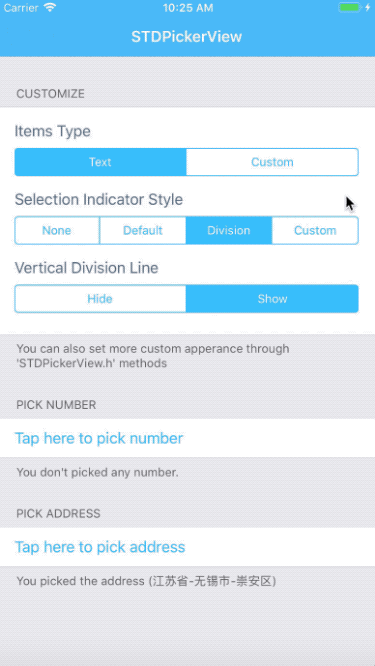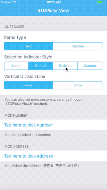 到现在已经基本确定UIPickerView的方案已经被毙了,不过没关系,原生没法实现那么就自己实现一个,于是 STDPickerView 就在这种情况下诞生了:
