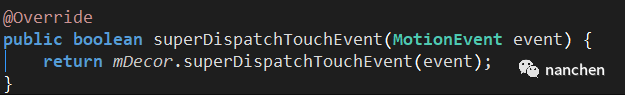 直接调用了 DecorView 的 superDispatchTrackballEvent() 方法。DecorView 继承于FrameLayout,作为顶层 View,是所有界面的父类。而 FrameLayout 作为 ViewGroup 的子类,所以直接调用了 ViewGroup 的 dispatchTouchEvent()。