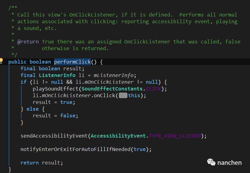 从上面的代码可以明显地看到,只要 View 的 CLICKABLE 和 LONG_CLICKABLE 有一个为 true,那么 onTouchEvent() 就会返回 true 消耗这个事件。CLICKABLE 和 LONG_CLICKABLE 代表 View 可以被点击和长按点击,我们通常都会采用setOnClickListener() 和 setOnLongClickListener() 做设置。接着在 ACTION_UP 事件中会调用 performClick() 方法,我们看看都做了什么。