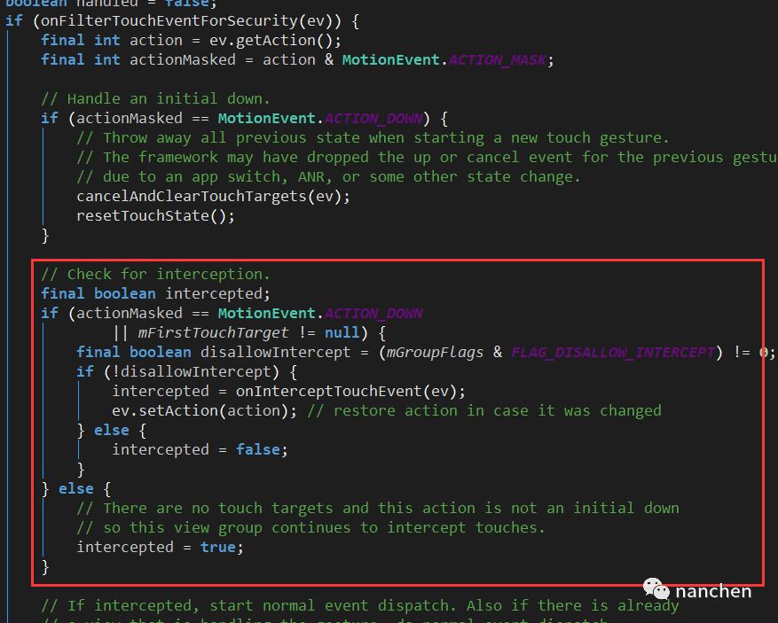 其中采用到了 onInterceptTouchEvent(ev) 对 intercept 进行赋值。大多数情况下,onInterceptTouchEvent() 返回值为 false,但我们完全可以通过重写onInterceptTouchEvent(ev) 来改变它的返回值,不妨继续往下看,我们后面对这个intercept 做了什么处理。