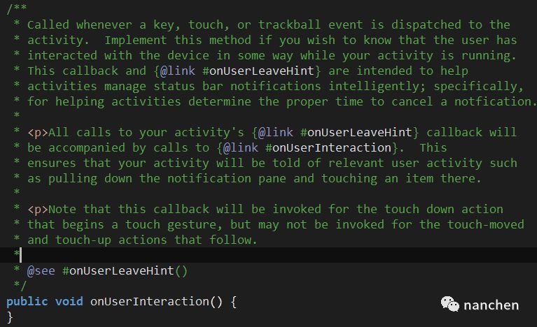 注意截图中,我增加了一些注释,便于我们更加方便的理解,由于我们一般产生点击事件都是MotionEvent.ACTION_DOWN,所以一般都会调用到 onUserInteraction() 这个方法。我们不妨来看看都做了什么。