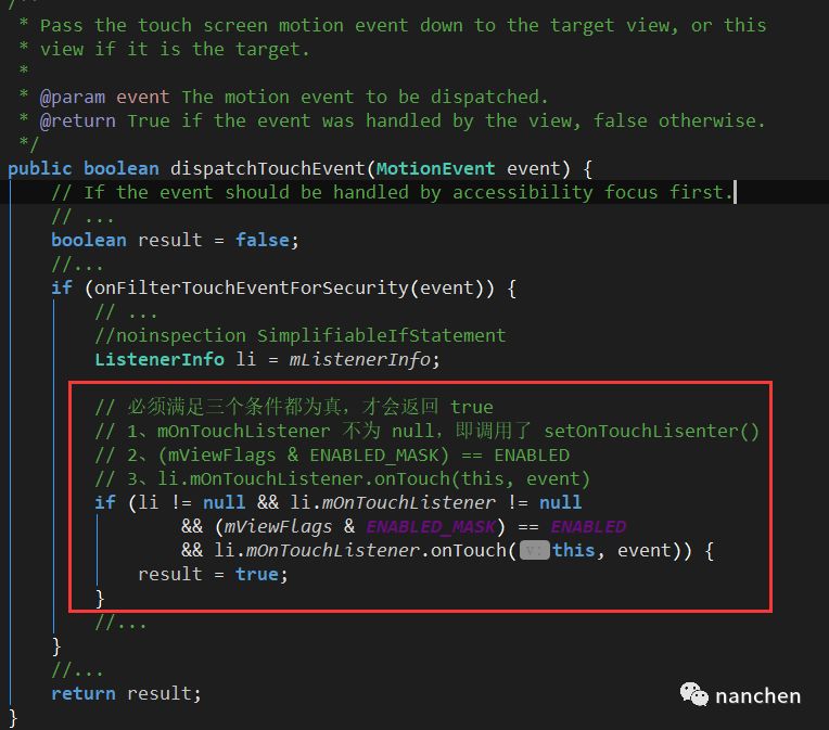 从上述的分析,终于知道「onTouch() 方法优先级高于 onTouchEvent(event) 方法」是怎么来的了吧。