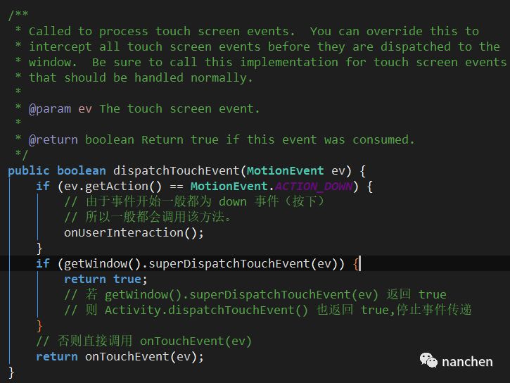 从英文单词中已经很明显的知道,dispatchTouchEvent() 是负责事件分发的。当点击事件产生后,事件首先会传递给当前的 Activity,这会调用 Activity 的 dispatchTouchEvent() 方法,我们来看看源码中是怎么处理的。