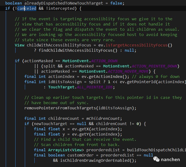 暂时忽略判断的 canceled,该值同样大多数时候都返回 false,所以当我们没有重写onInterceptTouchEvent() 并使它的返回值为 true 时,一般情况下都是可以进入到该方法的。