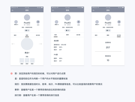 资料页面主要展示用户的相关数据,可以加入社交元素,例如关注、粉丝数、消息、约战等