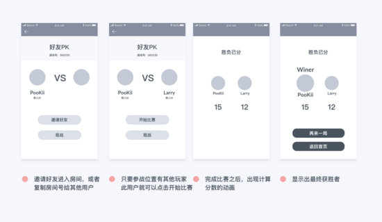 好友PK答题形式和竞技类似,用户先开一个房间,邀请好友,好用进入房间(可选择观战或者参战,原因是用户有可能会把对战邀请发到微信群里,这样可以让其他用户参与到PK中来)