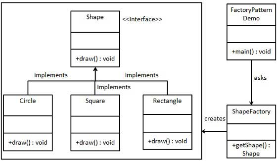 FactoryPatternDemo,我们的演示类使用 ShapeFactory 来获取 Shape 对象。它将向 ShapeFactory 传递信息(CIRCLE / RECTANGLE / SQUARE),以便获取它所需对象的类型。