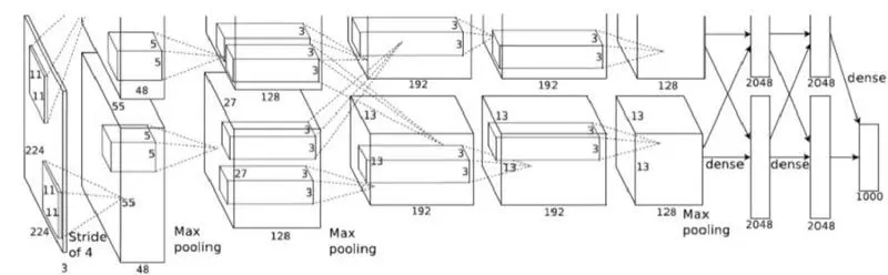 AlexNet 曾经以创纪录的极高准确度赢得了 2012 年 ImageNet 大规模视觉识别挑战赛,其架构在《利用深层卷积神经网络实现 ImageNet 分类能力》一文当中得到详尽描述。作者写道,“我们采用的并行化方案,在本质上相当于在每个 GPU 上放置半数 kernel(或者说神经元);另外我们还实施了另一项技巧,即 GPU 只在某些层中进行通信。”请注意这里的 kernel(kernel)表达。