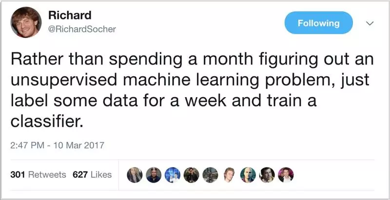 我们已经标注过数据,所以知道推文是如何分类的。如 Richard Socher 所说,比起优化一个复杂的无监督学习方法,寻找和标记足够多的数据来训练模型会更加快捷、简单和廉价。