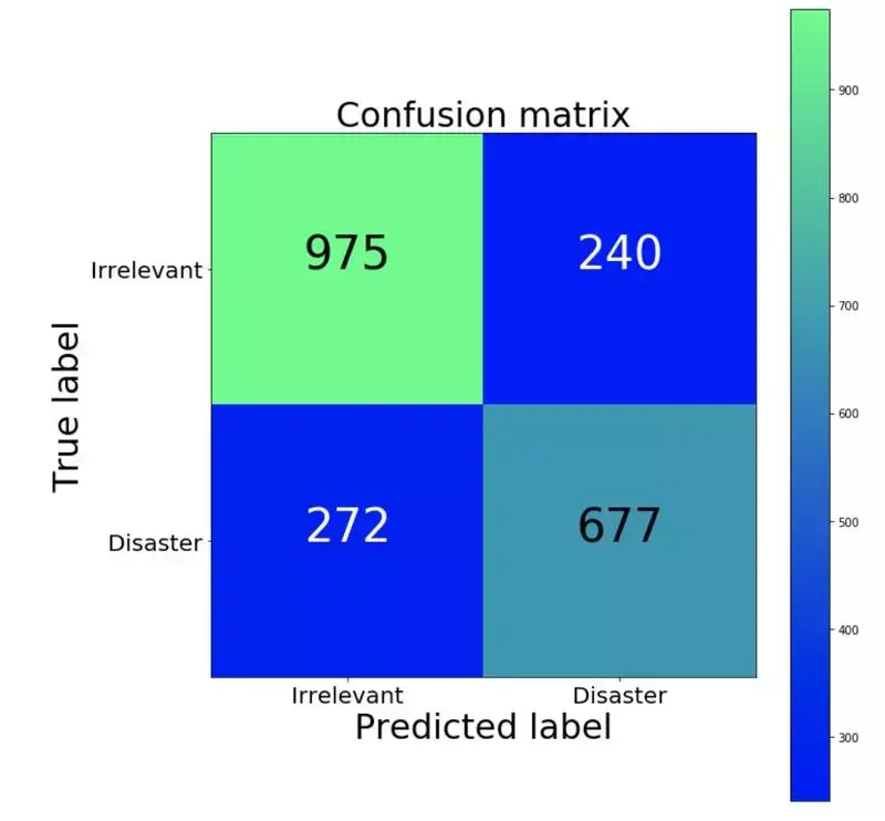 第一步是理解我们的模型会产生哪些错误类型,哪些错误是我们最不希望出现的。在例子中,误报(false positive)是指将不相关的推文归为灾难,漏报(false negative)是指将真实灾难归为不相关的。如果需要优先响应所有潜在事件,我们需要降低漏报率。如果是资源有限,我们就需要优先降低误报率来减少错误告警。我们可以使用混淆矩阵来可视化这些信息,它能将模型的预测与真实的标签进行比较。理想状态下,矩阵将形成一条贯穿左上角至右下角的对角线(此时预测值和真实值完美匹配)。