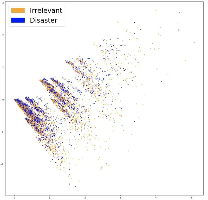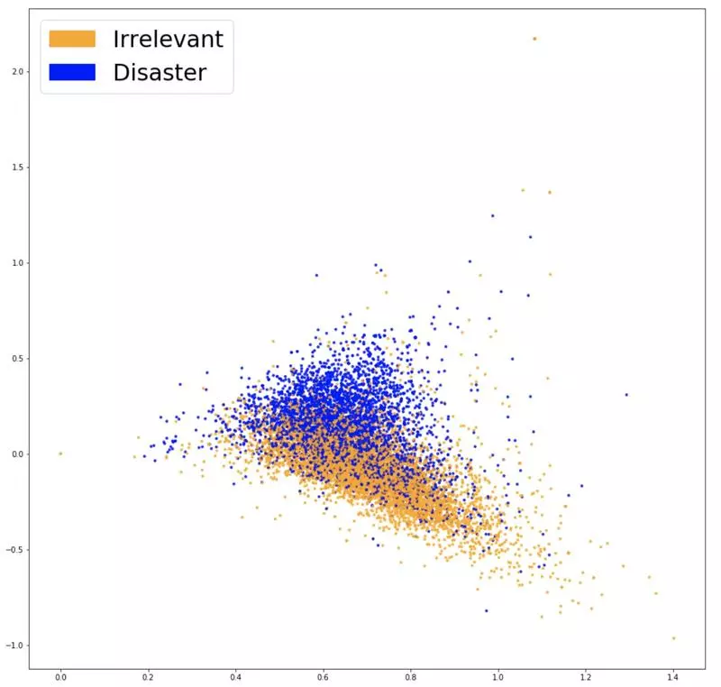 为了看出嵌入的工作是否真正抓住了和问题相关的信息(比如推文是否与灾难相关),有一个好方法是将它们可视化,然后观察结果是否有很好的分布。考虑到词表通常很大,而且用 20000 维的数据做可视化是基本不可能的,所以我们使用了 PCA 这种技术将数据降到二维。绘制如下: