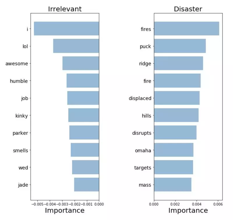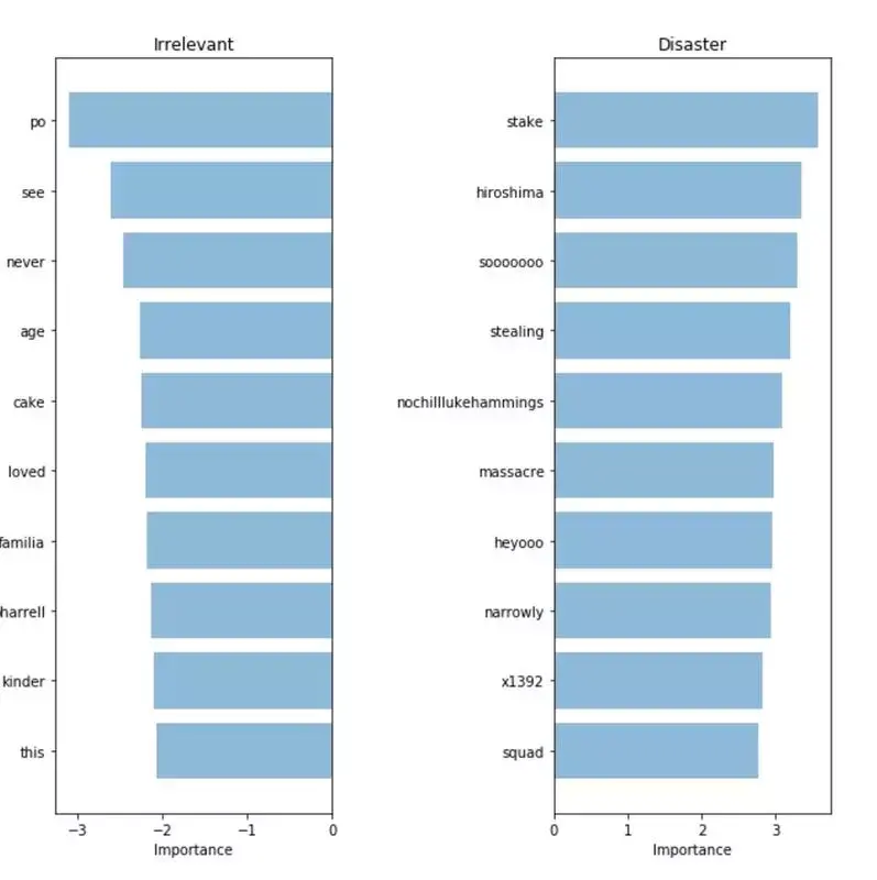 为了验证我们的模型并解释它的预测,就需要观察它是用哪些词来做决策的。如果我们的数据本身有偏差,分类器能基于样例数据做出准确的预测,但是将模型应用在真实世界中的结果就不会很理想。我们绘制出了灾难类和不相关类中最重要的一些词。用词袋模型和逻辑回归来绘制单词重要性非常简单,我们只需要将模型预测时使用的系数进行提取和排序。