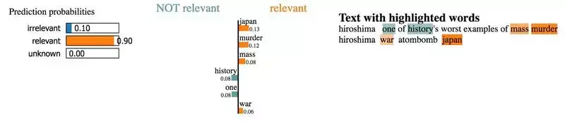 似乎能找出高度相关词语的模型就意味着能够做出可理解的决策。这些应该是使用之前模型产出的最相关的单词,因此我们能更安心地应用到生产中了。