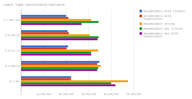 我们将在 V8 5.1、5.8、5.9、6.0 和 6.1 中查看微基准测试下它们的性能。
