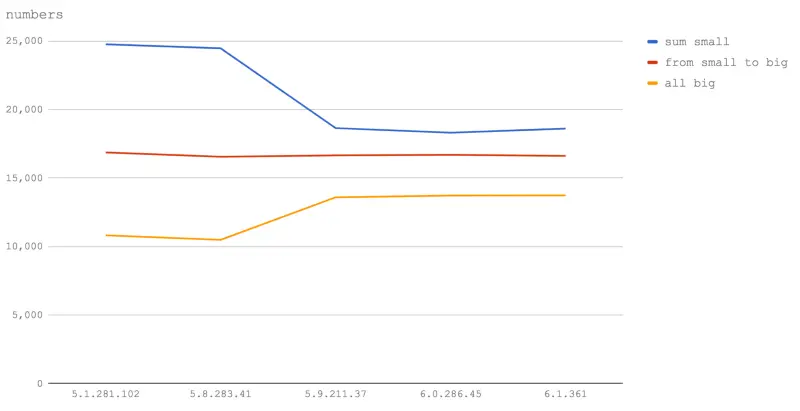 我们还为V8 5.8、5.9、 6.0 和 6.1 增加了三个额外的基准测试案例