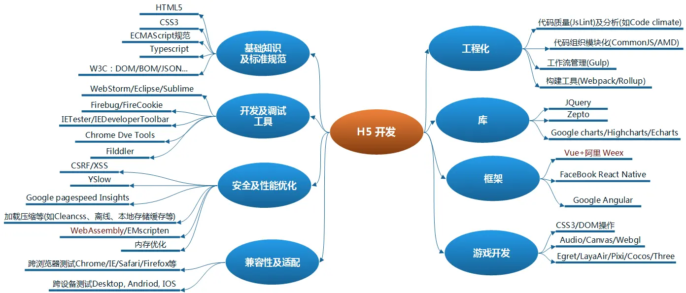 最后主要是游戏开发相关的,比如DOM CSS,还有Canvas、WebGL,以及一些游戏引擎。当然还有些其他点。 其实游戏开发这块,和整个H5开发来说,区别还是有一些的,做普通web开发的可以不用了解这块。所以在一些公司,已经将H5游戏开发与web前端开发分开了。 好,这里总结一下,H5游戏,就是基于H5技术合集开发出来的小游戏。