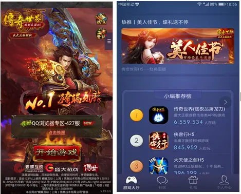 2017年,《大天使之剑H5》,公测24天流水破亿,逐渐形成盈利效应—(三七互娱); 同年,QQ、微信、QQ浏览器、腾讯视频开启H5小游戏专区; 企鹅游戏APP、玩吧APP等专门的H5游戏平台诞生。