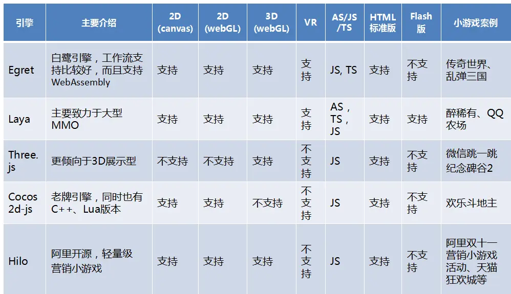 看一下这些游戏引擎的主要对比。白鹭,是目前社区非常活跃的H5引擎,去年宣布支持 webassembly,而且2d 3d vr都支持的,同时支持js、ts开发,经典的代表就是传奇世界。另外,laya引擎,是支持js ts as(actionscript)的。所以以前做flash/as开发的或许可以转到这上面来。然后还three.js,只支持3d的,跳一跳和纪念碑谷小游戏,都是通过three来的。然后cocos2d,这个也是一个老牌引擎,欢乐斗地主。然后再说一款,阿里也开源了一款H5小游戏引擎hilo。阿里双十一的营销活动小游戏、天猫狂欢城等都是通过这个来的。