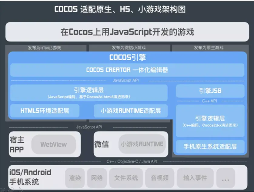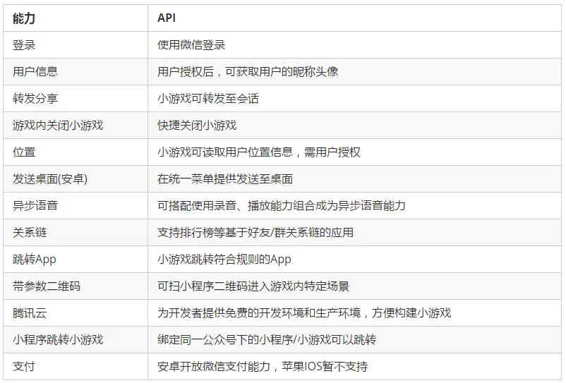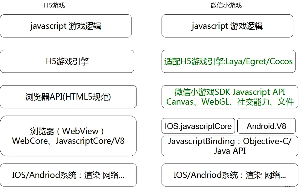 小游戏是在H5游戏的基础上增加微信社交能力、文件系统、工具链,去掉一些对游戏开发不是那么重要的,像Dom、Bom等,从这张图可以看出来,微信小游戏没有webview了,H5规范API这里是微信小游戏sdk自己实现的,比如canvas webgl。然后还有就是 游戏引擎这一层,是做了一个适配