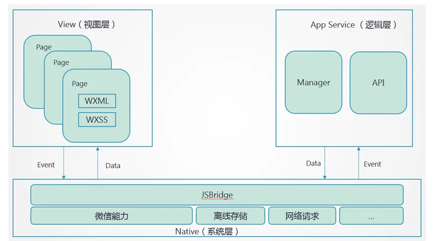 小程序的视图层目前使用 WebView 作为渲染载体,而逻辑层是由独立的 JavascriptCore(IOS)、X5(安卓) 作为运行环境。